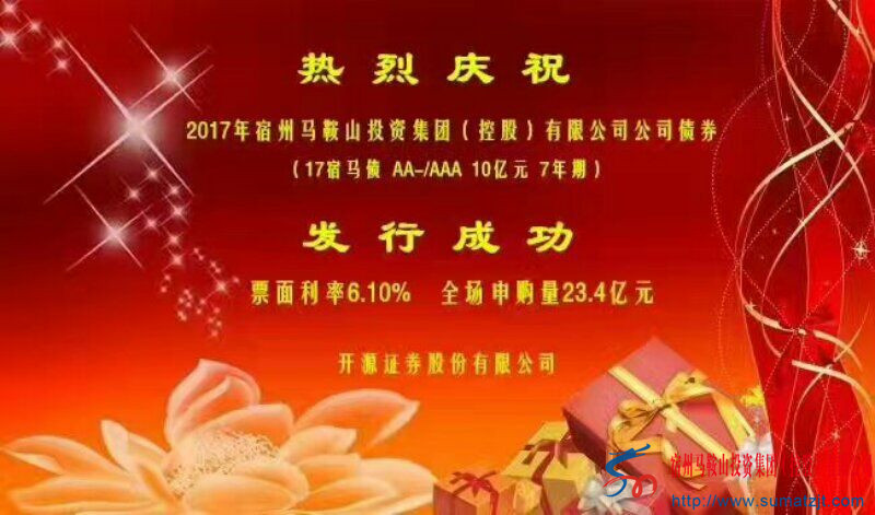2017年8月2日,宿州马鞍山投资集团(控股)有限公司10亿元企业债券发行成功!本期债券期限7年,全场申购量达23.4亿元,利率6.10%,该笔债券是宿马园区首支成功发行的企业债券。募集资金分别用于宿马园区保障房项目和补充营运资金